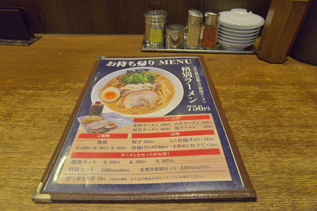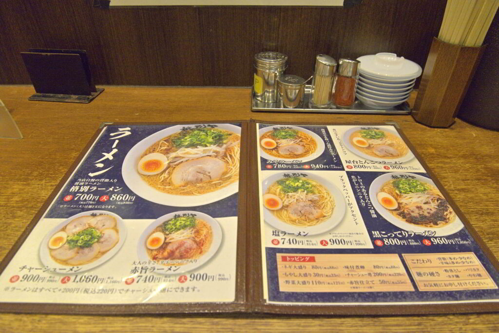 メニューの中心であるラーメンの種類は豊富で、格別ラーメン、味噌ラーメン、塩ラーメン、豚骨ラーメン、旨辛ラーメン、黒こってりラーメンなどがあります。