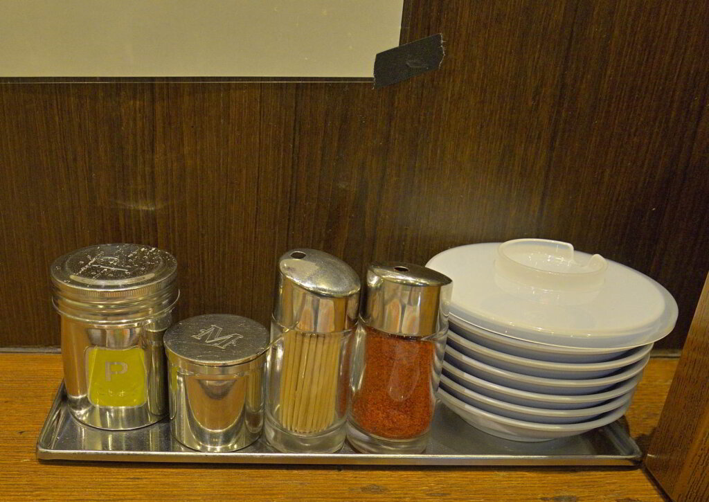 卓上には調味料として、胡椒、すりおろしにんにく、トウガラシがあります。