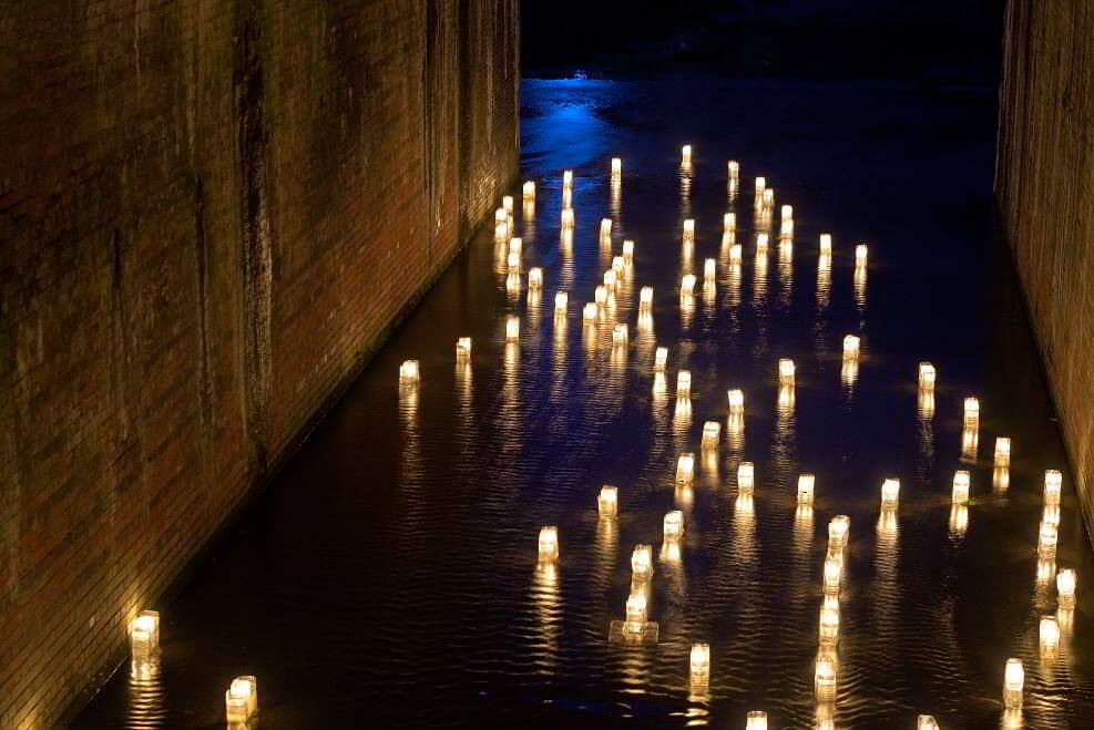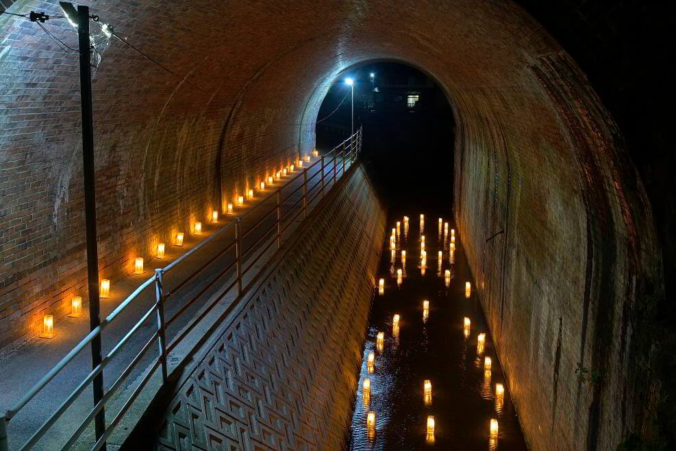 煉瓦で出来たトンネルや水路にキャンドルが並べられ、非日常的な景観になっています。