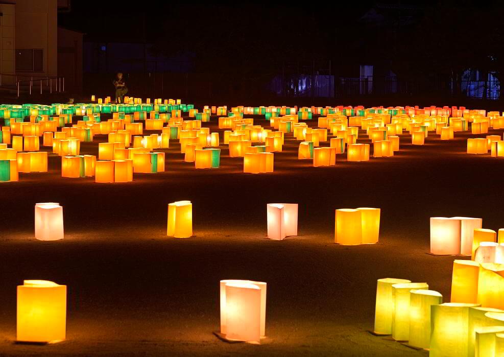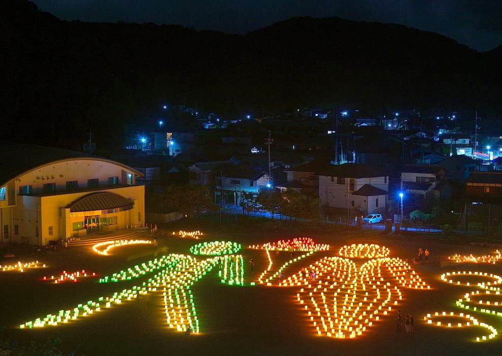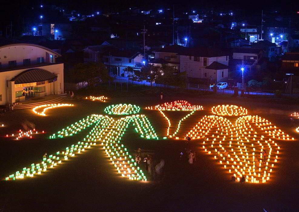 平面視点で見たのでは、規模の大きなキャンドルイベントに見えますが、お祭りの日にだけ解放されている校舎の上から見ると、ひとつの絵柄が浮かび上がってきます。