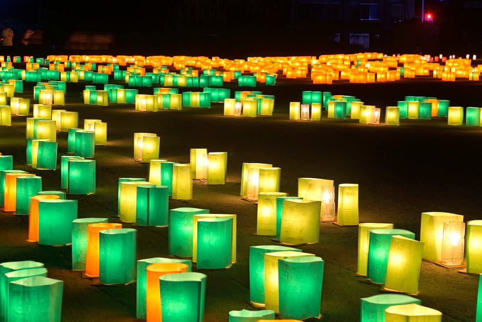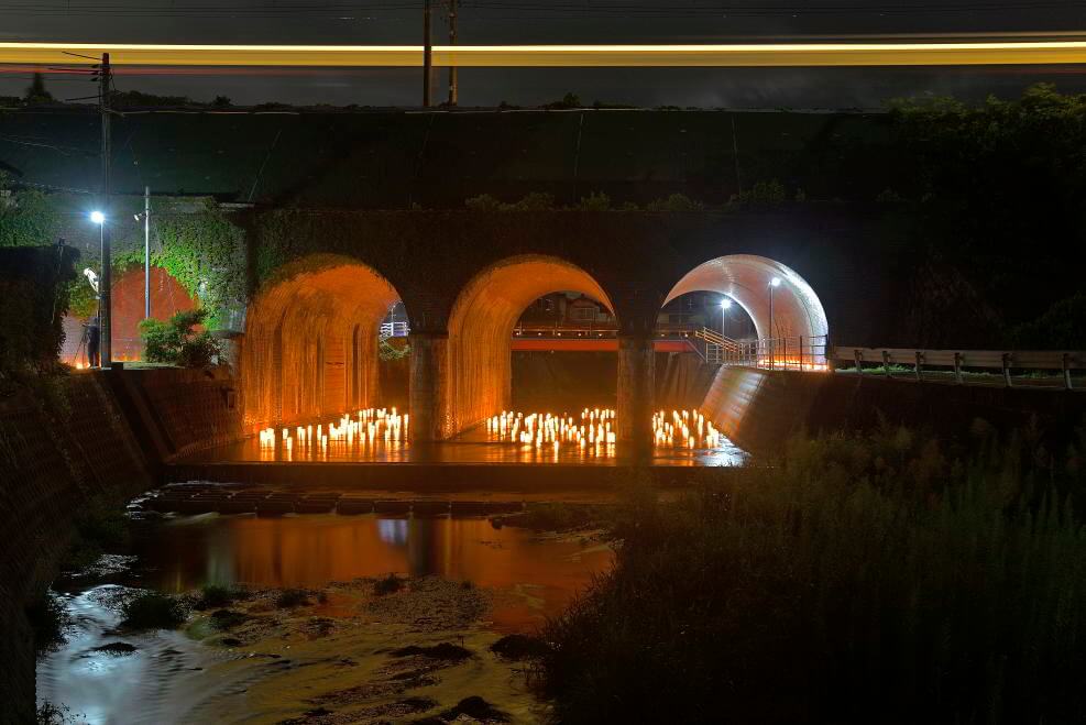 キャンドルで飾られているのは、三石八幡宮・レンガ積み拱渠アーチ橋(四列穴門)・三石中学校。