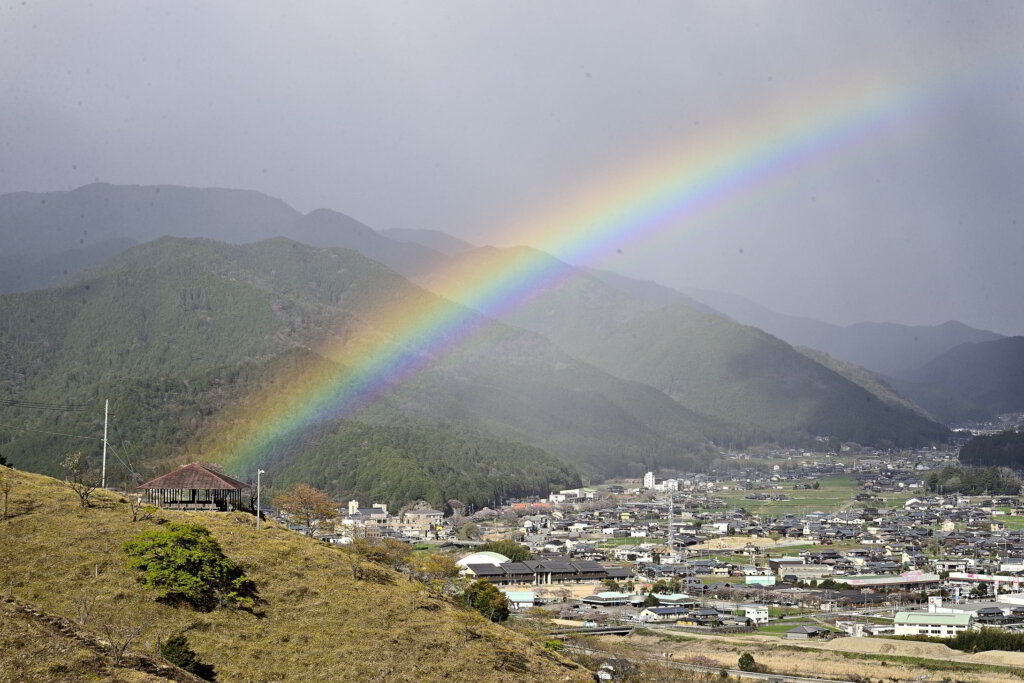 少し雨がばらつき、山から山にかかる綺麗な虹が見えました。