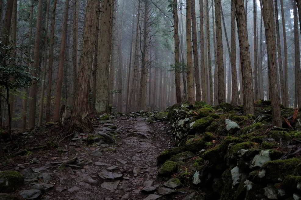 前夜の雨で霧の立ち込める林道を登っていきます。