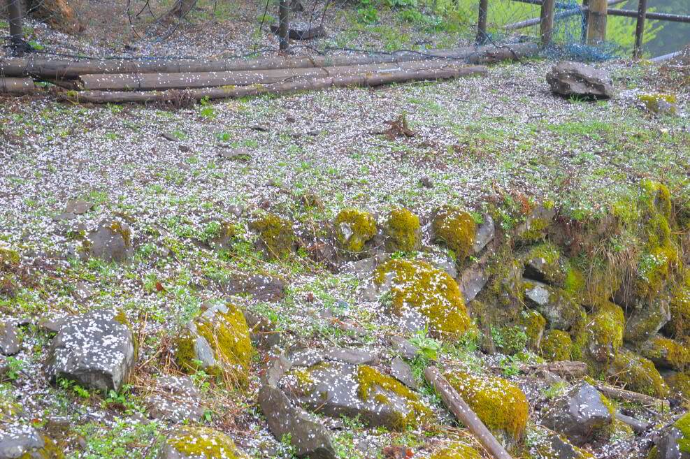 「ソメイヨシノ」より小ぶりな、「エドヒガン」の花弁が地面にちらほら見えます。